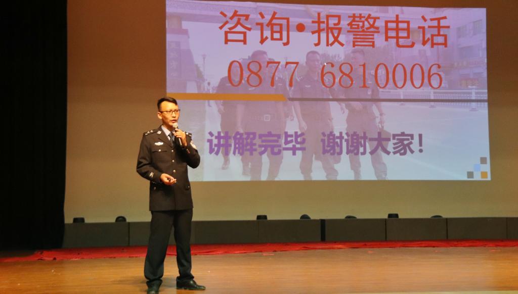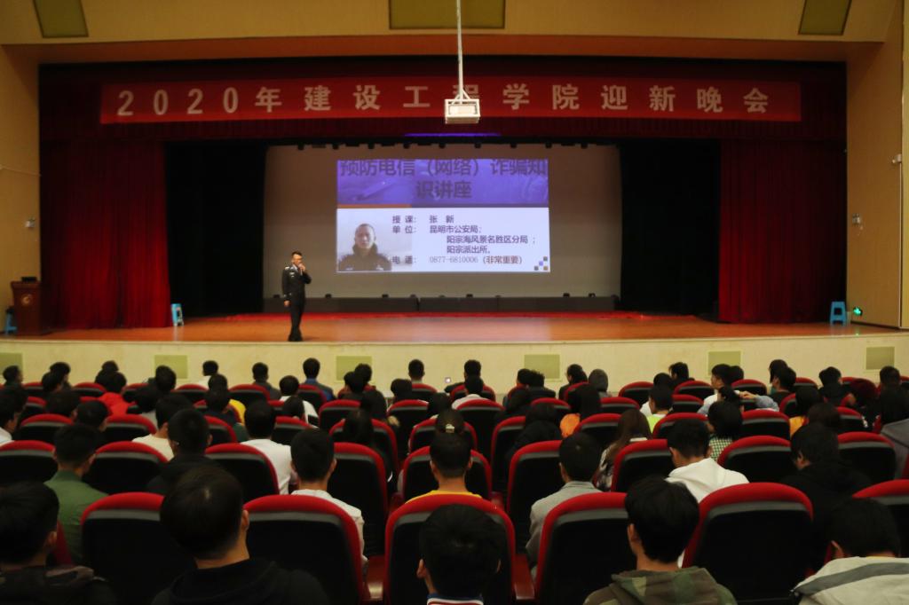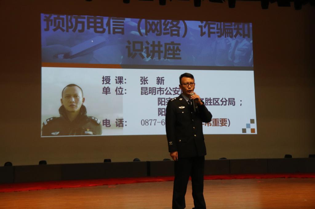 昆明市公安局阳宗海风景名胜区分局张新警官担任此次讲座的主讲人,金年会jinnianhuicom党总支副书记张星星老师、辅导员张诗琴老师,以及2020级全体新生参加了此次讲座。