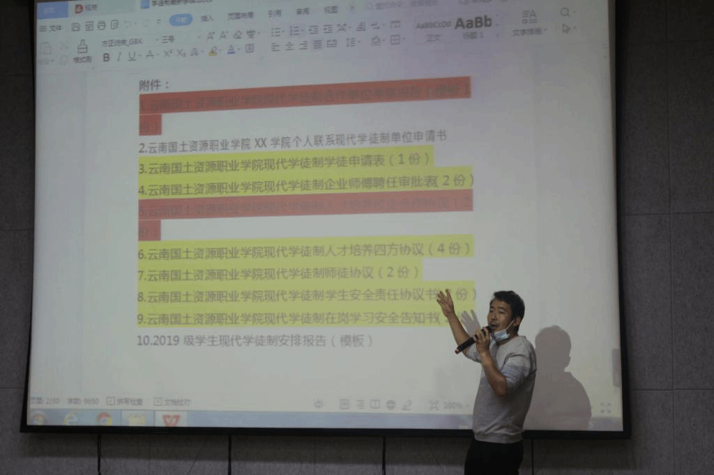 再次,魏老师讲解了现代学徒制的条件与要求,如现代学徒制为学生自愿申请、学徒企业必须是校企合作单位且企业必须在无疫情地区、学徒制期间一样需要在“工学云”APP签到、以及学徒制材料的办理和意外伤害险的购买等。