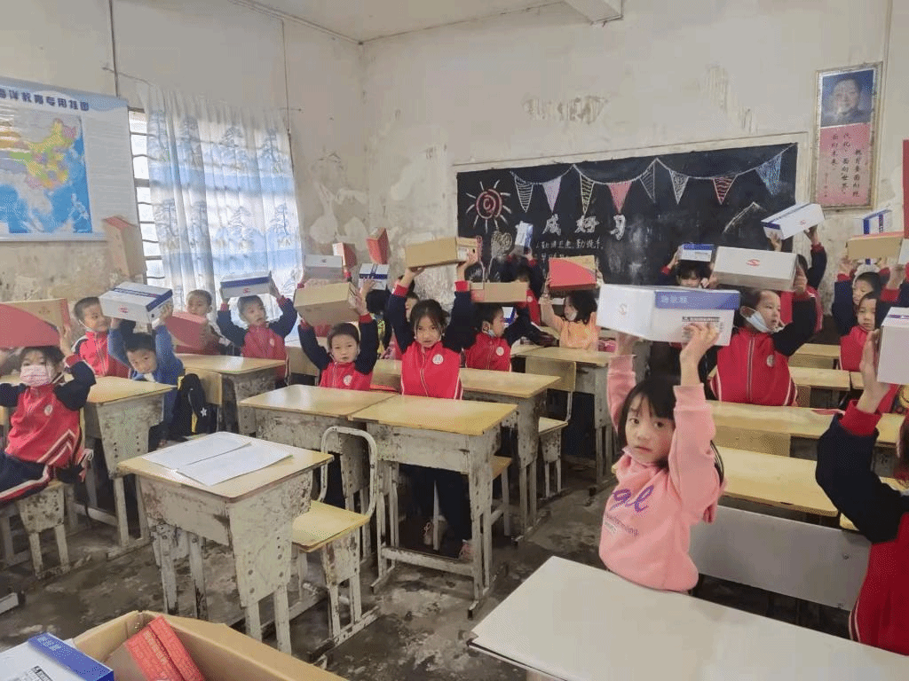 小学生们拿到自己的运动鞋后,开心地将鞋子举了起来。他们清澈童真的眼神,洋溢着的幸福笑容,感染了在场的每一位老师。成长路上的他们值得被关爱、被保护,关爱保护稚嫩的他们就是捍卫祖国的未来。