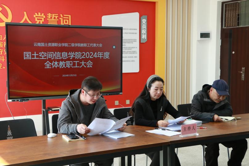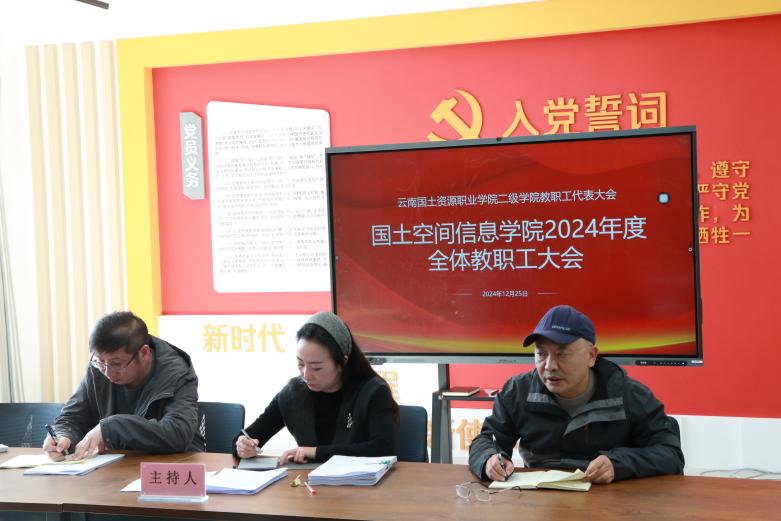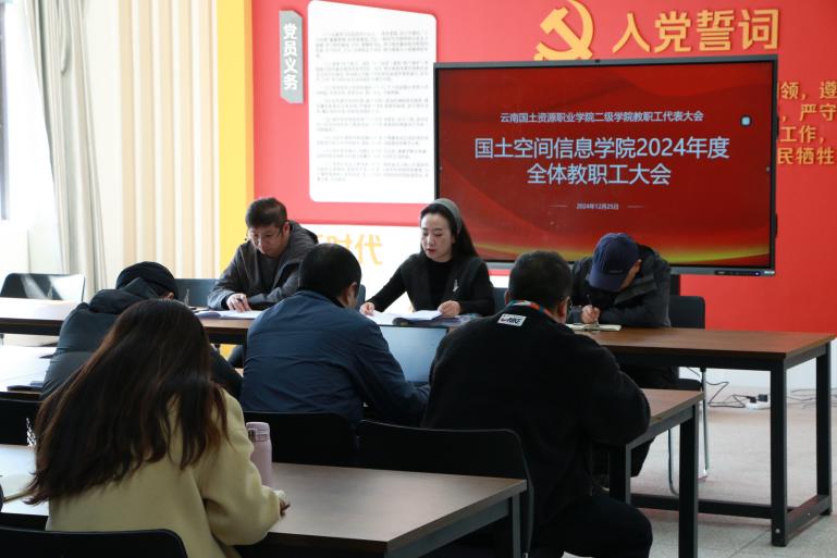 为深入学习贯彻习近平新时代中国特色社会主义思想和党的二十大精神,推动学院基层党建工作高质量发展,根据《云南国土资源职业学院二级学院教职工代表大会实施办法》相关要求,12月25日,金年会jinnianhuicom在勘A609召开学院2024年度全体教职工大会。会议由学院党委书记苏丽丹主持。