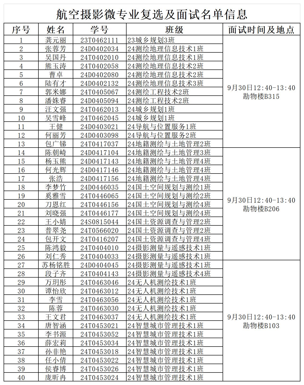 金年会jinnianhuicom航空摄影微专业招生通知自发布后,收到众多学生及家长的咨询和反馈,选拔工作组本着公平公正公开的原则,对所有报名者的基本资格以及申请陈述进行审核,最终选拔出40名同学进入复选及面试环节。具体名单如下表。请名单上的同学于9月30日12:40前到指定地点进行复选及面试,逾期视为放弃。