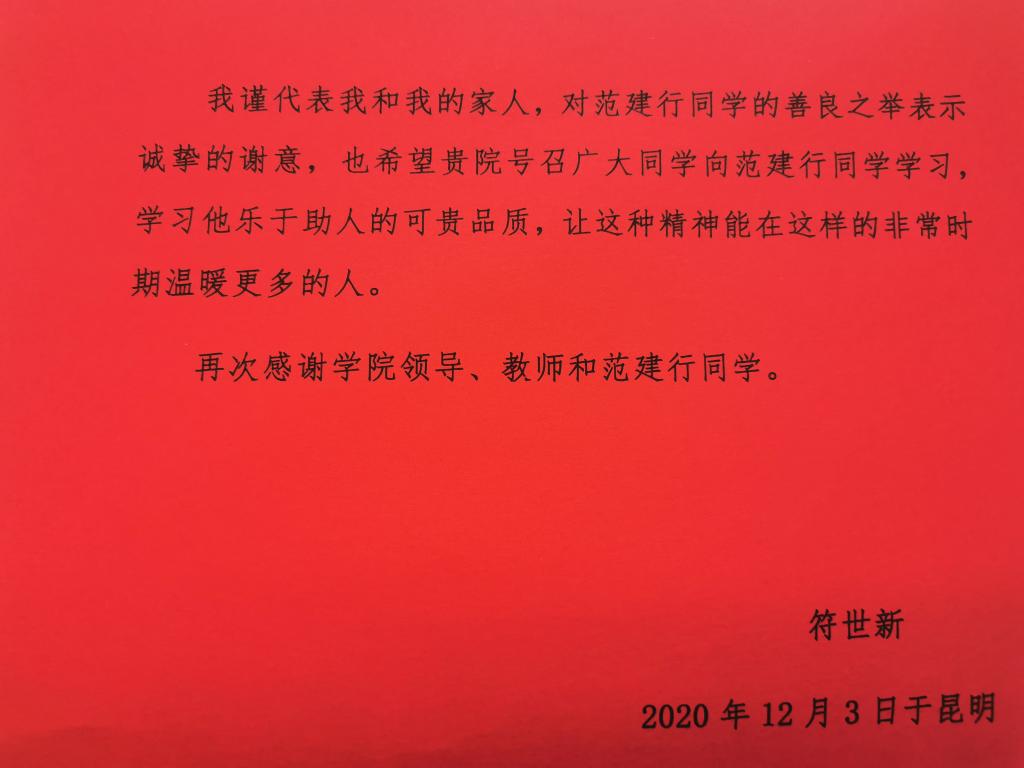 近日,金年会jinnianhuicom收到了一封感谢信,这是一封来自云南省工艺美术学校退休职工符世新老师对金年会2020级国土资源调查与管理专业9班范建行同学的感谢信。