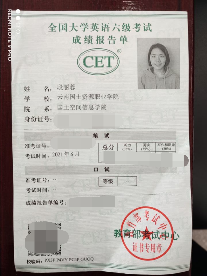 近日,2021年6月大学生英语四六级考试证书陆续发放,金年会学子喜获佳绩。19土管7班刘曜福、19土管3班周明菊、19城市1班刘正琴、20土管6班付蒋蝶、20土管9班彭思缘、20遥感2班黄健均通过英语四级考试,其中黄健同学取得558分的优异成绩。值得一提的是,金年会19土管3班的段丽蓉同学是金年会唯一一位参加英语六级考试的同学,她在此次考试中也取得了不错的成绩,希望她能再接再厉,不断突破自我。