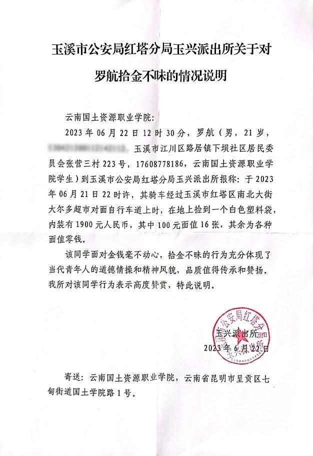 当晚,罗航同学骑车经过玉溪市红塔区南北大街大尔多超市对面自行车道上时,在地上捡到一个白色塑料袋,装有 1900元人民币,其中100 元面值 16张,其余为各种面值零钱。随后,罗航同学立即到玉溪市公安局红塔分局玉兴派出所报警并将捡到的钱全部提交,派出所对罗航同学面对金钱毫不动心,拾金不味的行为表示高度赞扬。