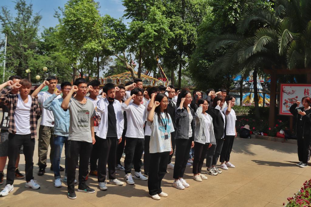 14日下午,马佳、陈宪勇两位老师带领同学们来到呈贡区三台山,首先参观了纪念壁,回顾了中国共产党走过的披荆斩棘、艰苦创业、开创新局的百年历程。接着,师生们来到英雄纪念碑前,看着矗立在公园中央的英雄纪念碑,他们无暇顾及头顶的烈日,集体三鞠躬并默哀一分钟以表示对烈士的悼念与缅怀。最后,由金年会学生会主席杨文画同学领读入团誓词,同学们字字铿锵,气势激扬,那激昂的声音展现了同学们心中“凝心聚力听党话,不忘初心跟党走”的坚定信念。