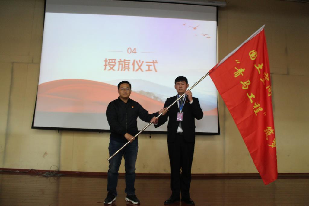 紧接着,学院团总支负责人马佳将班旗授予学院团总支副书记龙在闯。