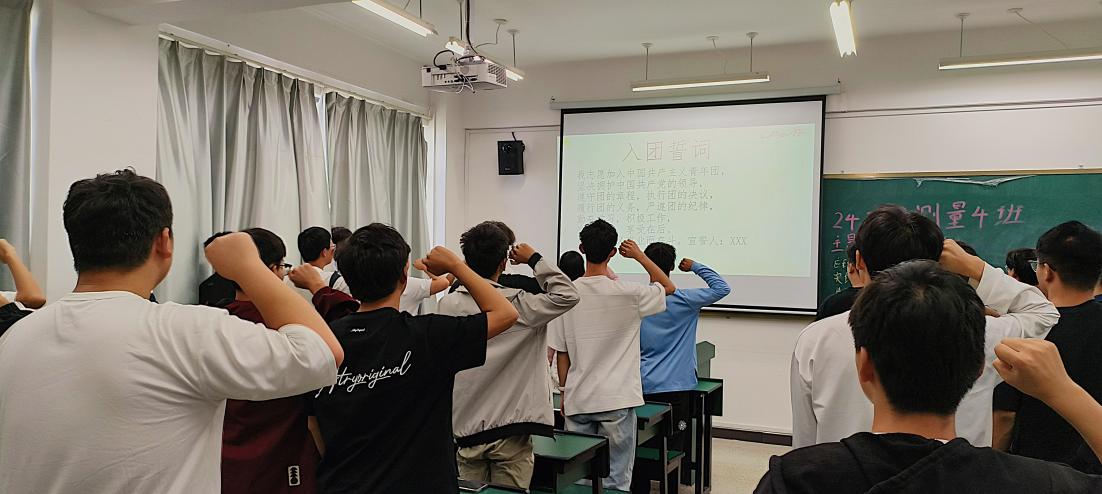 团支书费强带领同学们庄严宣读入团誓词,齐唱团歌《光荣啊,中国共青团》,同学们声音充满热情、坚定有力,表达了对党和国家的忠诚与热爱。随后,同学们还认真学习了党的二十届三中全会精神,并纷纷表示作为新时代青年应握稳手中的接力棒,肩负起历史赋予的责任和使命。