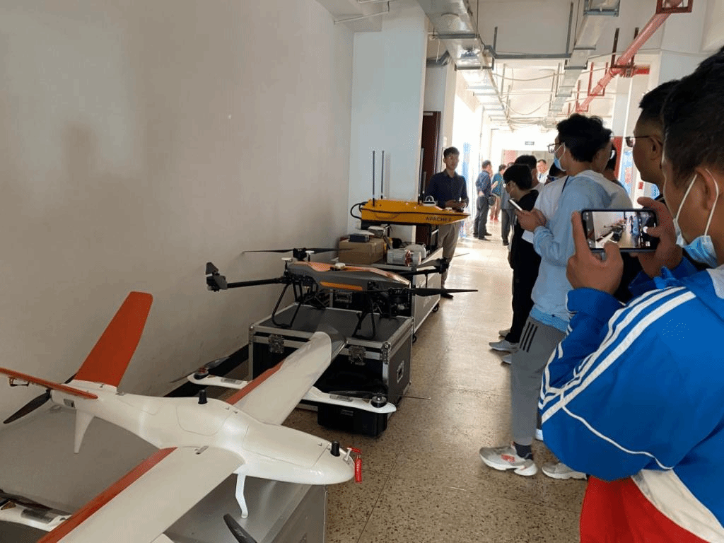 活动开始前,空信学院师生围在展板前认真听测绘科技工作者介绍测绘科普知识。最吸引师生的是在现代化的导航设备,同学们在无人机、无人船、高精全站仪展位前看得兴致勃勃,激动地憧憬着未来的工作场景。