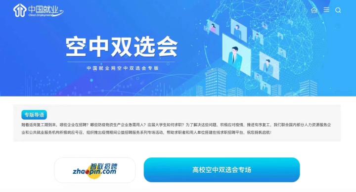 近日,中国就业网上线了智联招聘的空中双选会,据悉,智联招聘搭建的“空中双选会”是企业和求职学生线上招聘和应聘的平台,企业与学生可以在线进行双向互动,实时沟通,视频面试的一站式校招线上招聘平台。企业可以在线发布职位,收取并管理简历,搜寻意向学生信息;而学生可以在线获取企业信息和职位信息并投递简历,同时可以在线实时查看应聘状态。