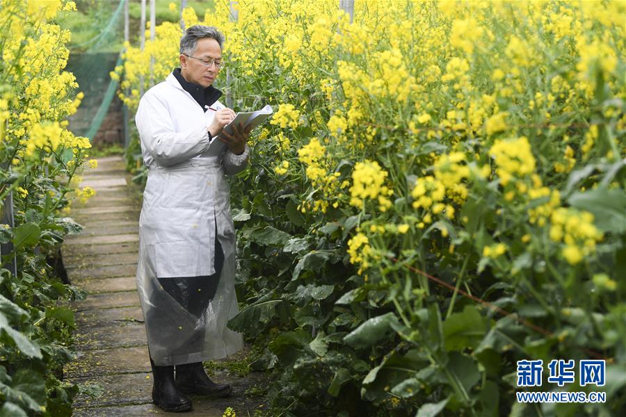 3月5日,重庆市油菜工程技术研究中心负责人李加纳教授在观察记录油菜生长情况。 时下正值油菜花期,重庆市油菜工程技术研究中心的农学专家带领学生和技术工人抢抓农时,推进油菜科研和育种工作。 新华社记者王全超摄