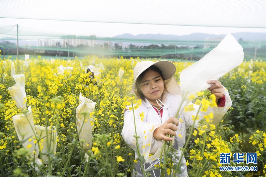 3月5日,工人在重庆市油菜工程技术研究中心油菜试验田内给油菜花套袋。 时下正值油菜花期,重庆市油菜工程技术研究中心的农学专家带领学生和技术工人抢抓农时,推进油菜科研和育种工作。 新华社记者王全超摄
