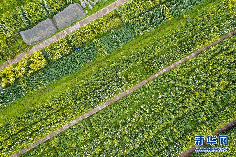 3月5日,工人在重庆市油菜工程技术研究中心油菜试验田内作业(无人机照片)。 时下正值油菜花期,重庆市油菜工程技术研究中心的农学专家带领学生和技术工人抢抓农时,推进油菜科研和育种工作。 新华社记者王全超摄