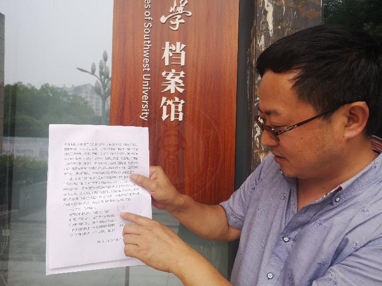 ▲西大档案馆副馆长郑劲松介绍当年的书信复印件。西大供图