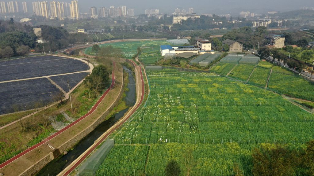 ↑2月22日拍摄的重庆市油菜工程技术研究中心的油菜花田(无人机照片)。