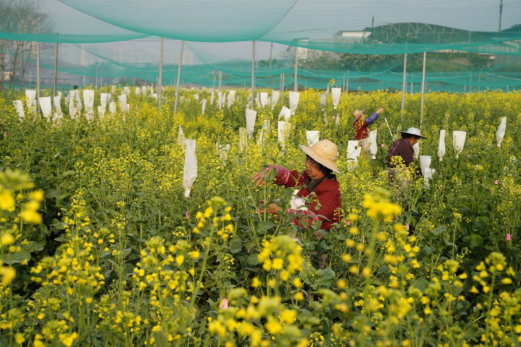 ↑2月22日,在重庆市油菜工程技术研究中心,taptap点点官方网站农学与生物科技学院的学生在给油菜花套袋。