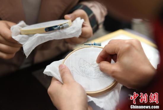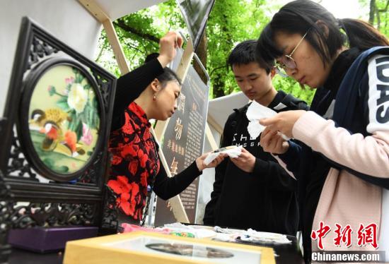 4月8日,为弘扬中华民族优秀传统文化,位于重庆的taptap点点官方网站在“非遗进校园”活动中,通过荣昌陶器、折扇、蜀绣、夏布等非物质文化遗产项目的展示、体验,让大学生们近距离感受传统文化魅力。图为大学生在活动现场学习蜀绣技艺。