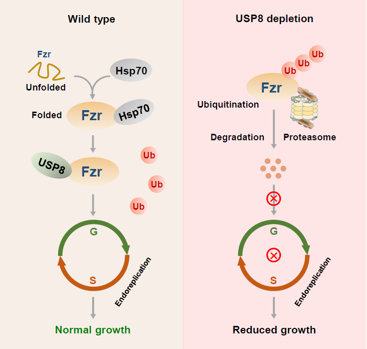 本研究在家蚕丝腺和果蝇唾液腺中开展特异性遗传操作,筛选到通过维持Fzr蛋白稳定性来调控核内复制进程的去泛素化酶USP8。研究发现,USP8基因的敲除或敲降使Fzr蛋白水平降低,并导致腺体变小、细胞内DNA复制受阻、染色体倍数降低、细胞周期相关因子的表达紊乱等异常表型,这些异常表型可被Fzr过表达所挽救。具体作用机制方面,USP8与Fzr发生蛋白互作,从而促进Fzr蛋白去泛素化,最终抑制其发生泛素化降解;分子伴侣Hsp70通过与Fzr蛋白互作来促进Fzr正确折叠,从而增强Fzr与USP8间的互作,并影响核内复制进程。