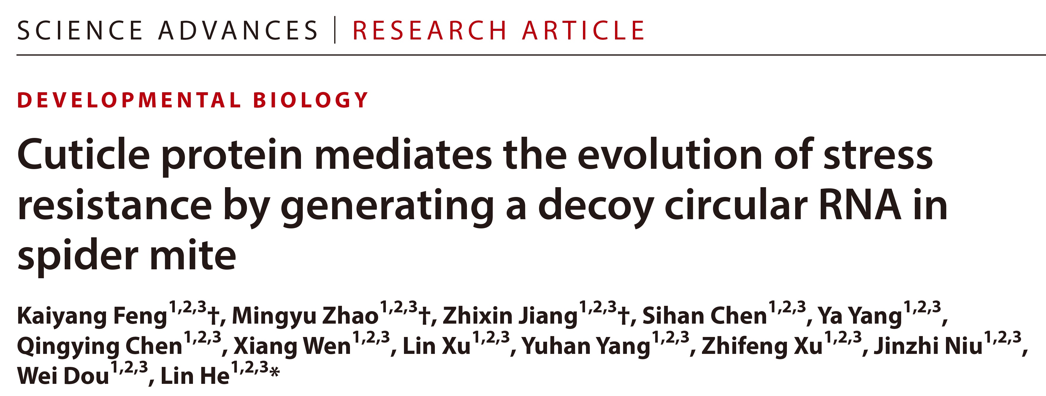 近日,taptap点点官方网站何林教授团队在Science子刊Science Advances上在线发表了题为“Cuticle protein mediates the evolution of stress resistance by generating a decoy circular RNA in spider mite”(译:朱砂叶螨表皮增厚介导抗逆性进化的诱饵RNA机制)的研究论文,首次发现并系统阐明了朱砂叶螨表皮发育增厚会导致其对多种杀螨剂产生广谱的交互抗性,表皮蛋白可通过释放“诱饵”RNA拮抗并抑制miRNA簇的功能,从而调控自身过表达,最终导致朱砂叶螨表皮发育增厚,促进其抗逆性进化的分子新机制。