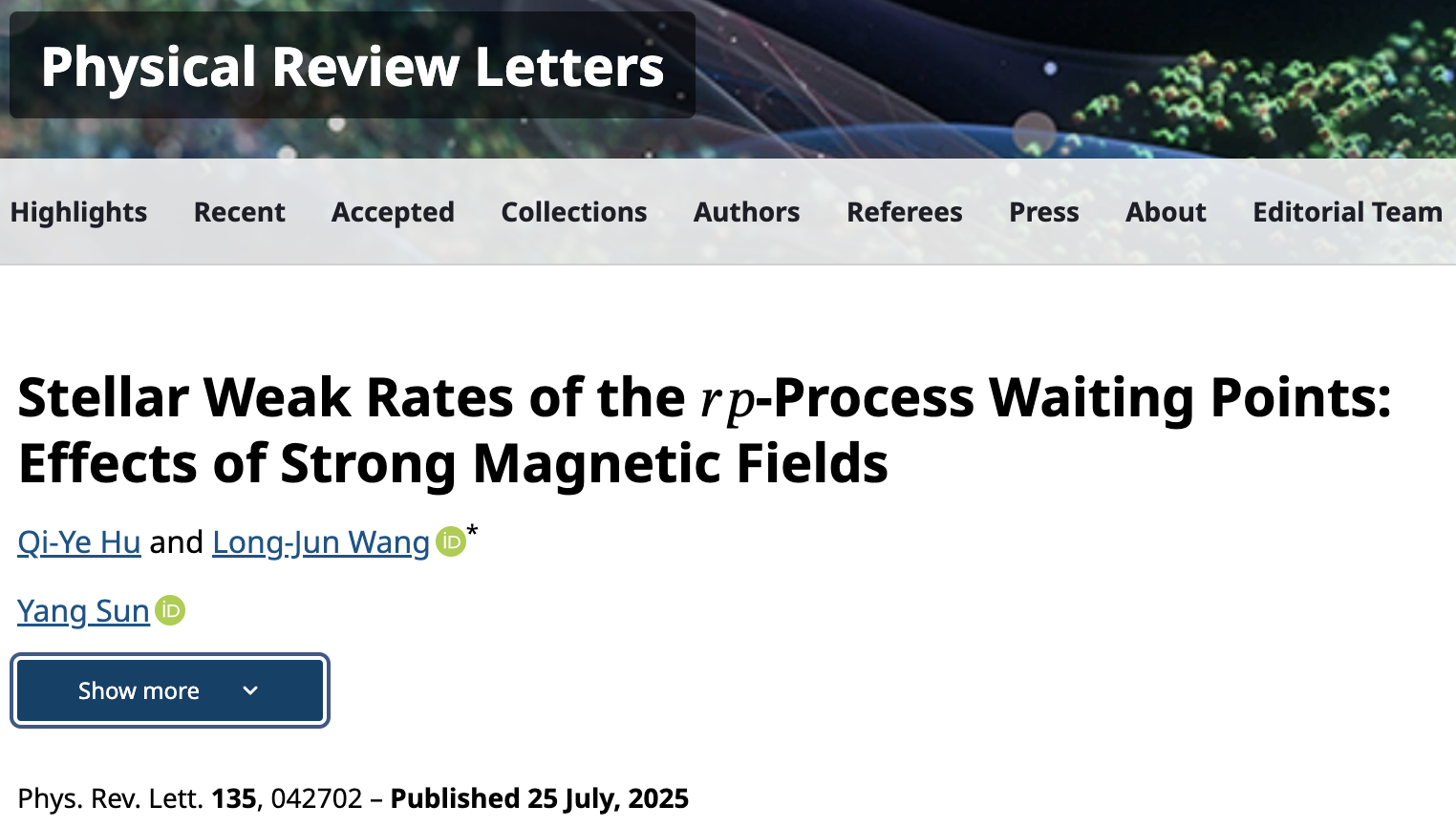 近日,物理科学与技术学院王龙军教授与上海交通大学孙扬教授合作,在物理学顶级期刊《物理评论快报》(Physical Review Letters)发表了题为《快质子俘获过程等待点核的天体弱衰变率:强磁场效应》(Stellar Weak Rates of the rp-Process Waiting Points: Effects of Strong Magnetic Fields)的研究论文。