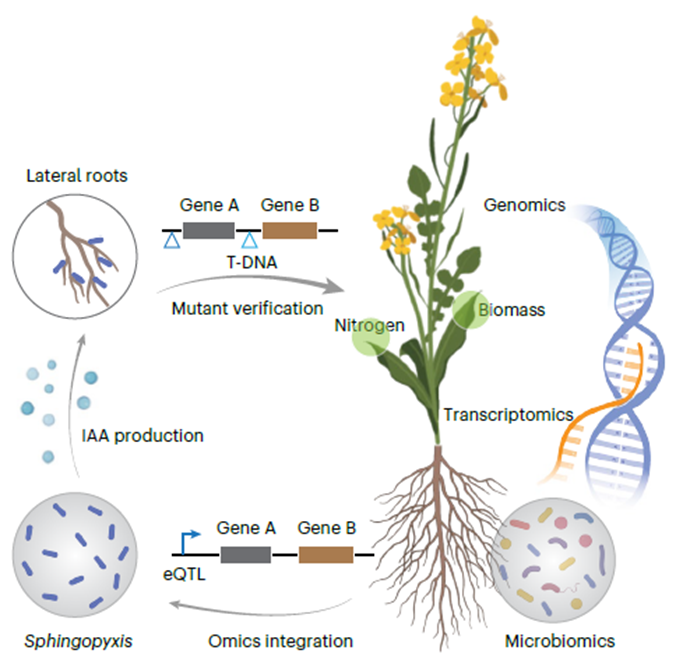 课题组选取了175份具有广泛遗传多样性的甘蓝型油菜种质,在两个典型田间环境下系统调查了根系转录组、根际细菌16S rRNA谱和植株离子组,构建了1341组配对多组学数据集。通过全基因组关联分析、转录组关联分析与表达数量性状位点定位,鉴定出203个具有中高遗传力的细菌扩增子序列变异,其中多个ASV与根系氮含量显著相关。尤为重要的是,宿主转录组与微生物组数据联合解释了高达45%的氮吸收自然变异。进一步地,锁定了受宿主强遗传调控的关键细菌属—鞘氨醇盒菌属(Sphingopyxis)。通过高通量培养、全基因组测序与功能验证,证实该菌能通过合成生长素(IAA)促进油菜侧根发育,从而增强低氮条件下的氮素获取能力。