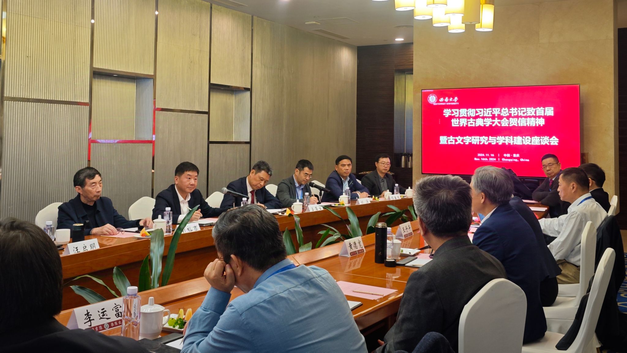 11月16日下午,学校组织召开古文字研究与学科建设座谈会。教育部语言文字信息管理司二级巡视员王丹卉、全国高等院校古籍整理研究工作委员会吴国武副秘书长、中国文字学会会长清华大学黄德宽教授、中国古文字研究会会长吉林大学吴振武教授,以及来自中国社会科学院、北京大学、四川大学、北京语言大学等十余所高校和科研院所的知名专家学者参加座谈会,学校副校长邹芙都以及社会科学处、汉语言文献研究所负责人出席座谈会。会议由邹芙都主持。