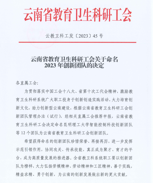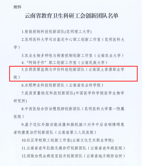 2023年11月28日,云南省教育卫生科研工会公布了《关于命名2023年创新团队的决定》,金年会孙晓莉老师带队组建的“自然资源监测与评价科技创新团队”成功入选,喜获殊荣。