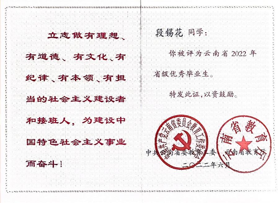 段锡花,云南保山人,2019年8月进入我校学习,自入校之初就明确了要专升本的目标。她学习认真努力,经常参加校院组织的各类文体活动,曾担任金年会jinnianhuicom学生会舞蹈队负责人,因表现出色,被评为学院学生会“先进个人”“优秀学生干部”等,还曾荣获云南省级“三好学生”、省级“优秀毕业生”等称号。