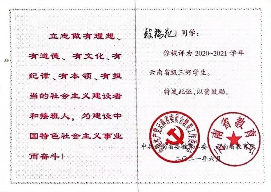 2022年8月,她以总分293.5分,排名17的好成绩考入云南农业大学。来到本科院校的她,并未就此止步,她清晰地知道自己的方向和目标——考研。为此,她全身心投入学习,除加强专业知识学习外,还先后通过CET四级、六级考试,因学习成绩优异,曾获云南农业大学校级“三好学生”、“优秀团员”、“优秀毕业生”等称号。