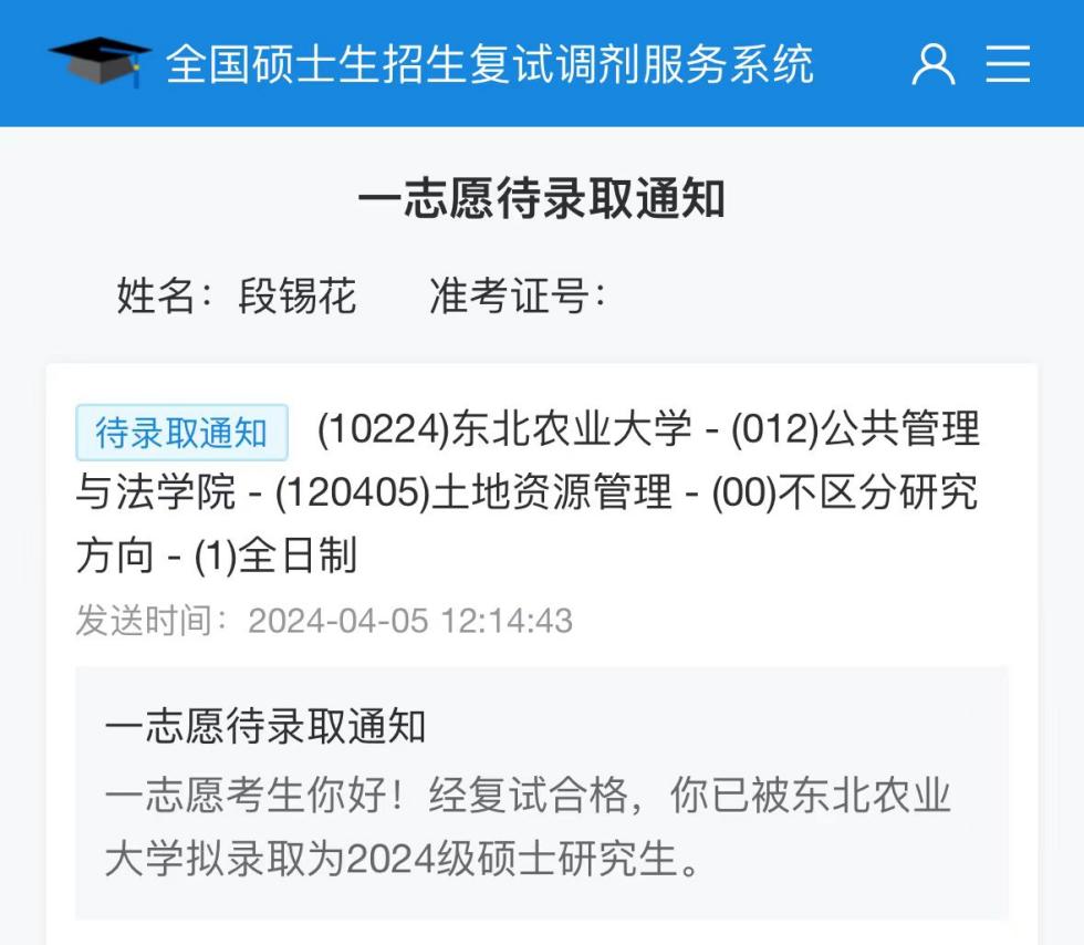 一分耕耘,一分收获。段锡花以388分的成绩顺利进入东北农业大学的复试环节,并顺利通过复试。