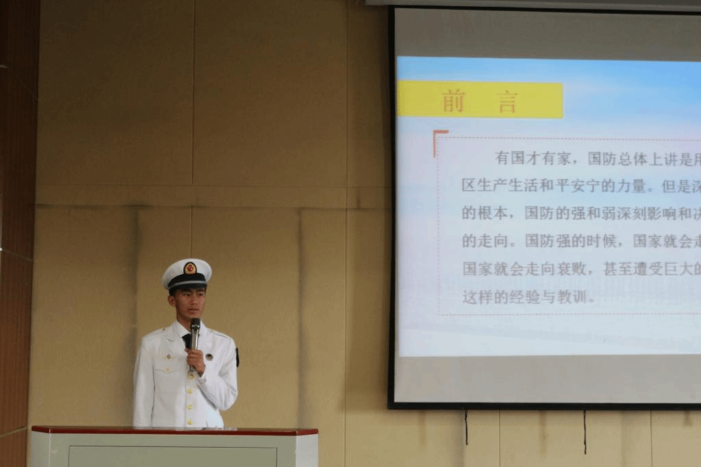 其次,退伍学生代表罗浩楠从征兵入伍条件及流程、相关政策、入伍优势三个方面做了详细的介绍,让同学们对参军入伍有了初步的认识;李俊宏同学通过一张张图片、一段段视频带领在场同学们了解军营生活,让大家身临其境地体会到了部队的风采;韩金银同学则从军营伙食方面为同学们做了介绍,他讲到,军营不仅是艰苦的,也是丰富多彩的,希望同学们能够把握住青春,踊跃报名参军。