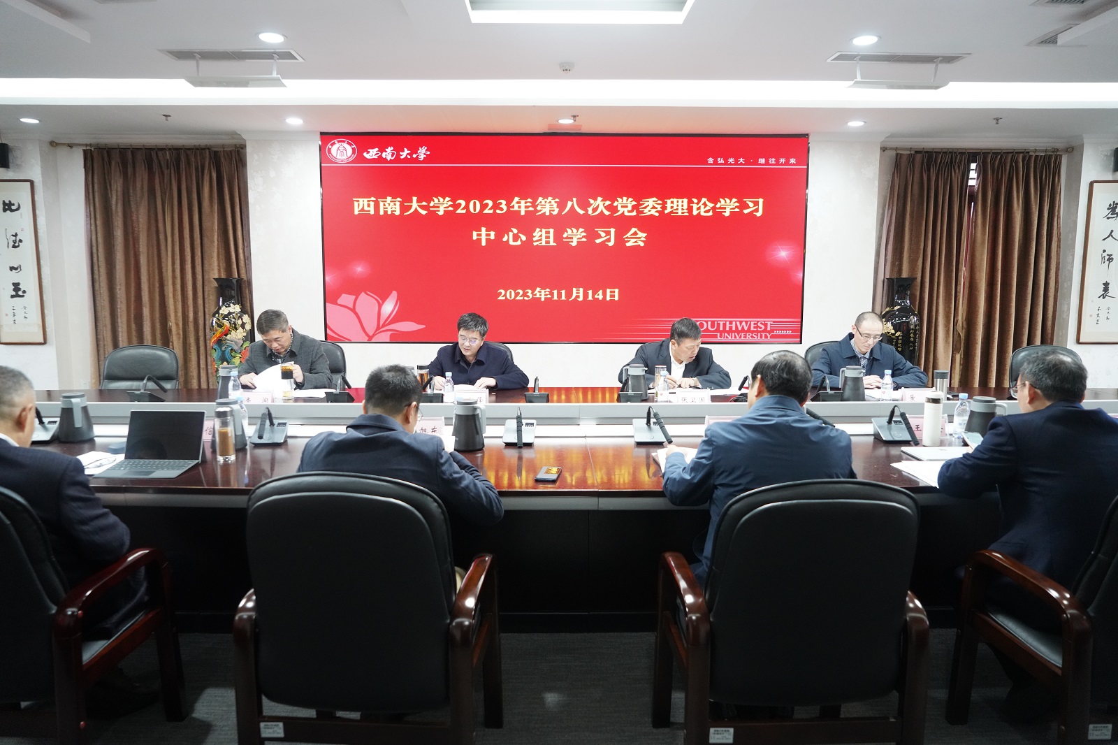 11月14日,学校召开2023年第八次党委理论学习中心组学习会,专题学习研讨习近平文化思想。全体在校校领导、党委常委参加。党委书记李旭锋主持会议。