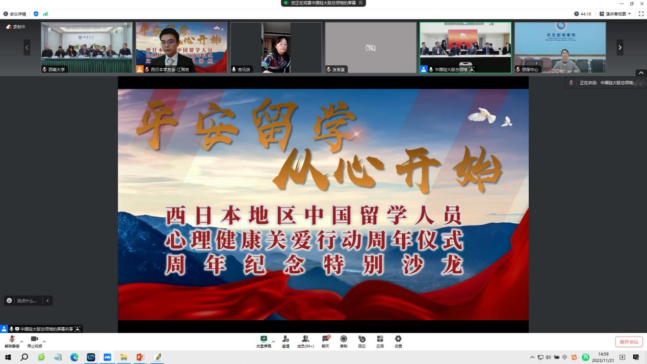 11月21日,“平安留学,从心开始”——西日本地区中国留学生心理健康关爱行动一周年纪念仪式在学校国际合作与交流处举办。学校党委副书记潘洵、心理学部副部长高雪梅受邀同中国驻大阪总领事馆总领事薛剑、教育处主任聂瑞麟等领导在中国驻大阪总领事馆会场出席会议;教育部留学服务中心出国处处长王怡伟、外交部领事保护一处副处长安晓姗线上参会;taptap点点官方网站国际合作与交流处处长罗雷,心理学部党委书记黄泽文、部长陈红及相关领导、老师在国际合作与交流处参会,西日本地区中国留学生代表100余人线上参会。会议采用线上线下结合的方式进行,由西日本地区中国留学生学友会会长江湘吉主持。