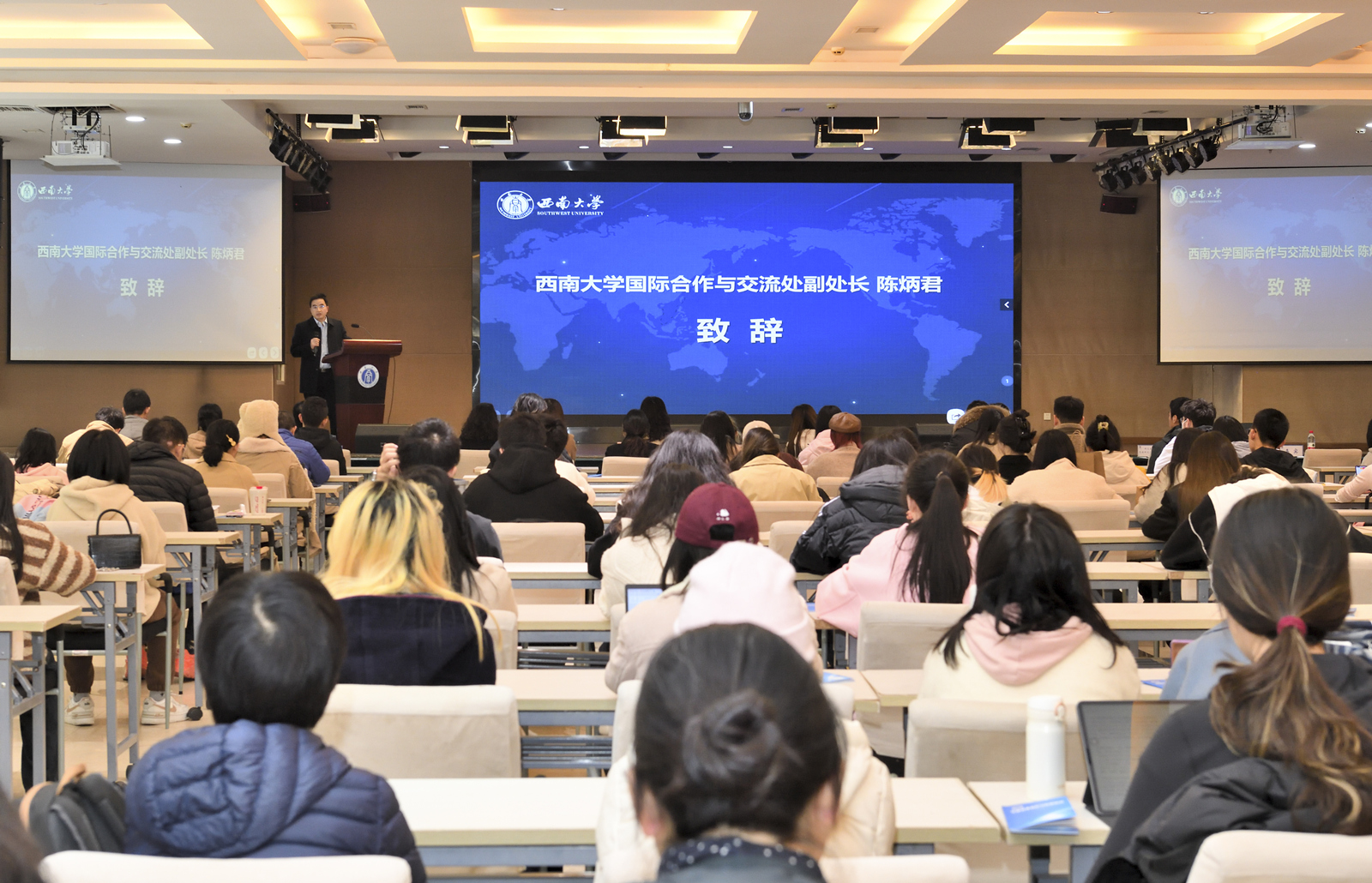 国际合作与交流处有关负责人致辞,简要介绍学校近年来在国际化人才培养方面做出的努力和取得的成效。他表示,当前我国正进入全面建设社会主义现代化国家开局起步的关键时期,中国式现代化需要更高层次、更高标准、更高质量的人才支撑,希望即将出国的师生们勇担时代使命,为全面推进中华民族伟大复兴贡献青春智慧与力量。