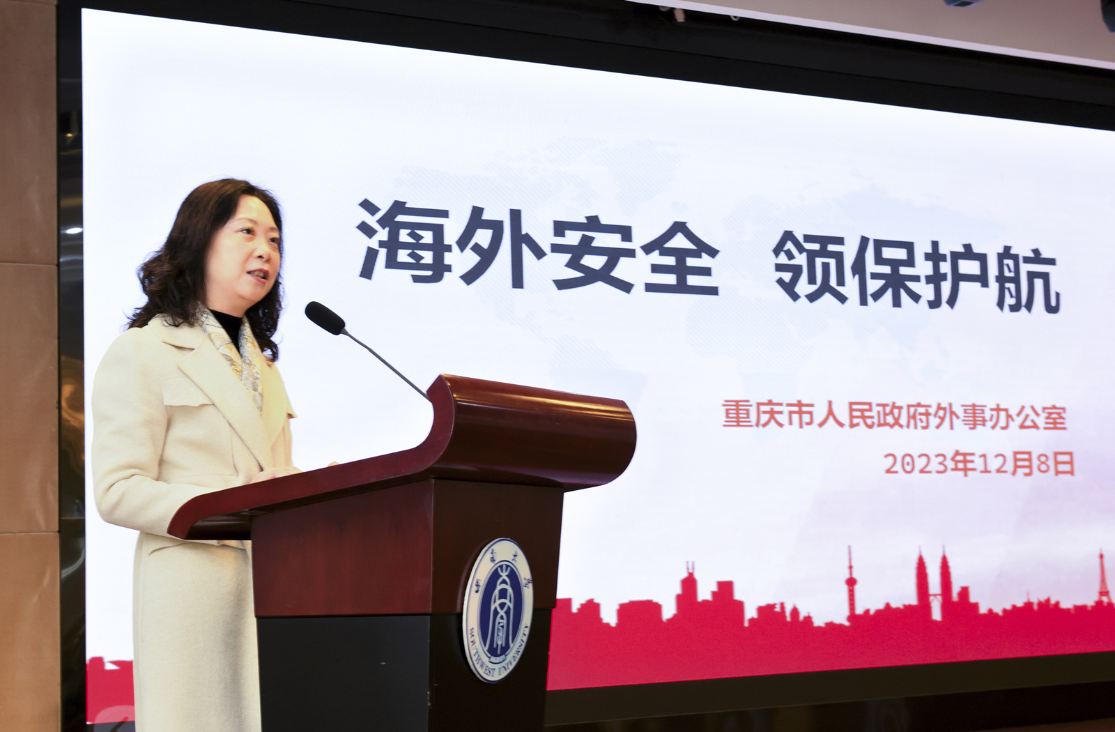 杨瑜以“海外安全 领保护航”为题作报告,从当前海外安全形势、领事保护工作、典型案例警示、外交部领保服务平台四个方面向师生们普及了领事保护知识和海外安全常识,并结合丰富的工作经验和案例,指导师生们防范风险与寻求保护,呼吁留学人员增强法律意识,维护好自身权益,实现平安留学。