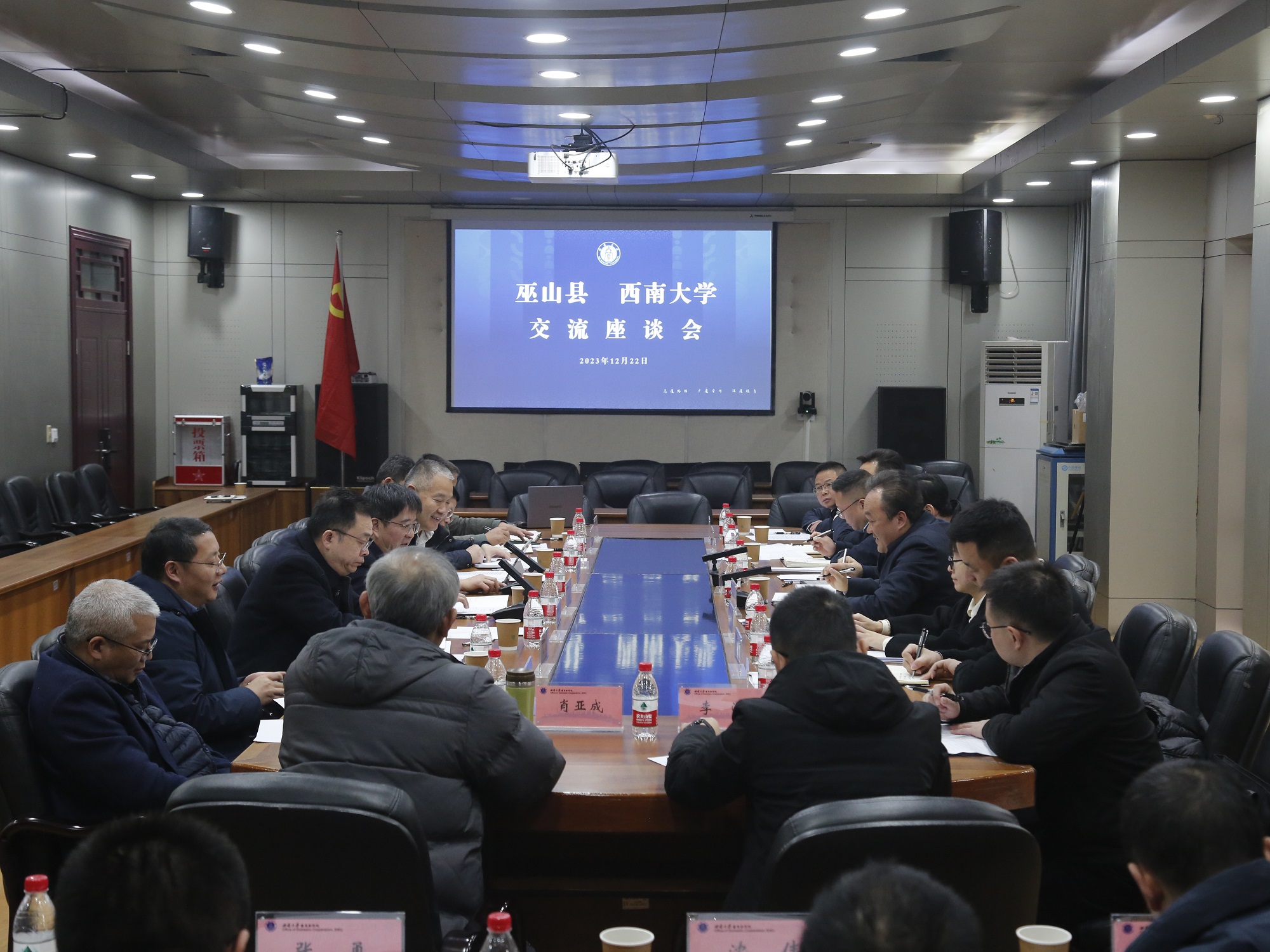 12月22日,巫山县委书记曹邦兴,县委常委、统战部部长刘海燕,县政府副县长乔澍一行来校推进县校合作。学校党委书记李旭锋出席座谈会,副校长葛信勇主持会议。