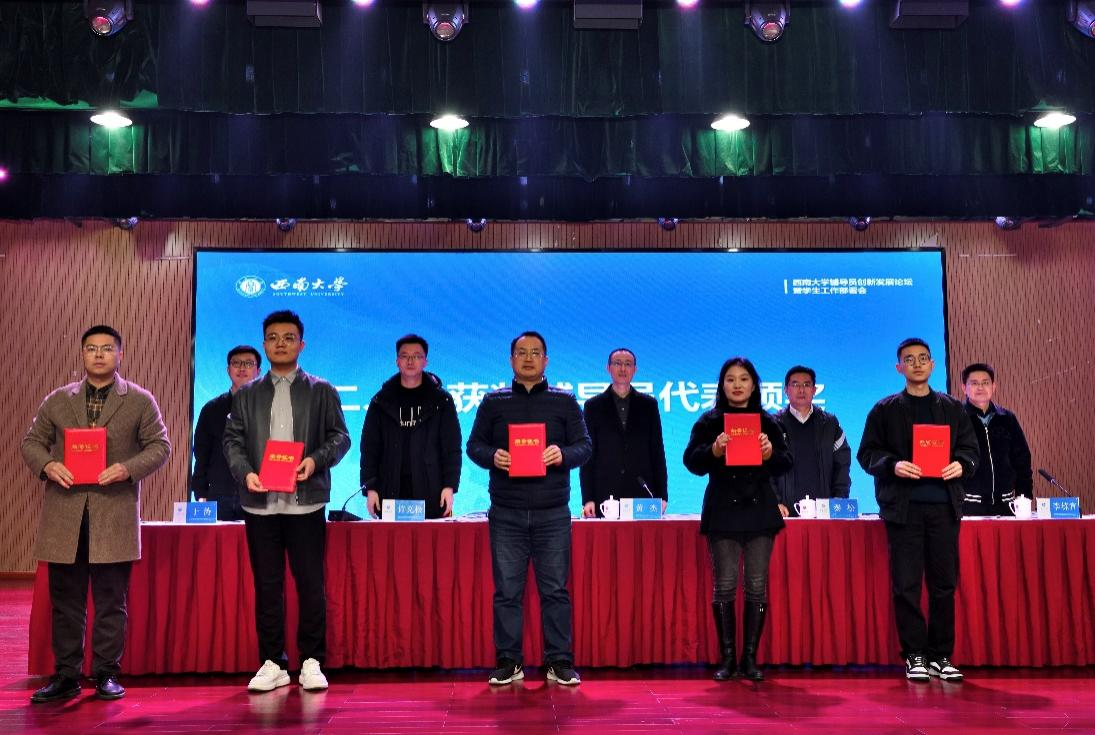 黄杰宣读了2023年辅导员素质能力大赛、辅导员创新发展论坛优秀论文和案例获奖者名单,并与职能部门负责人一同为获奖代表颁奖。