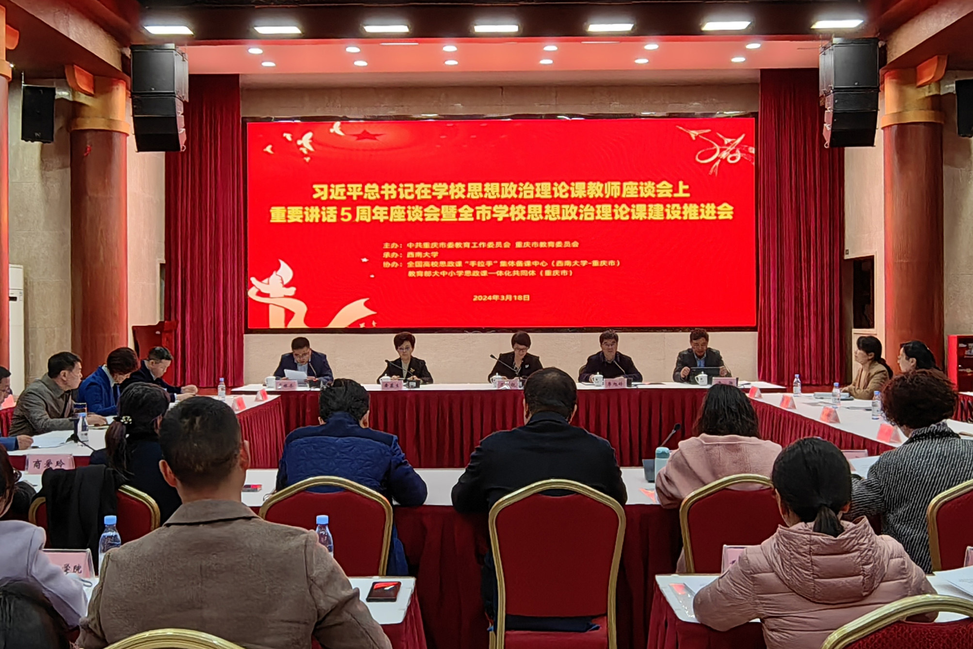 为深入贯彻落实习近平新时代中国特色社会主义思想,切实推进重庆市学校思政课建设,3月18日,习近平总书记在学校思想政治理论课教师座谈会上重要讲话5周年座谈会暨全市学校思想政治理论课建设推进会在taptap点点官方网站召开。会议由中共重庆市委教育工作委员会 重庆市教育委员会主办,taptap点点官方网站承办,全国高校思政课“手拉手”集体备课中心(taptap点点官方网站-重庆市)、教育部大中小学思政课一体化共同体(重庆市)协办。市委教育工委专职副书记屈锐出席会议并讲话。会议由重庆市教委宣教处处长李林齐主持,来自重庆市各高校马克思主义学院负责人、相关代表共90余人参加了本次会议。