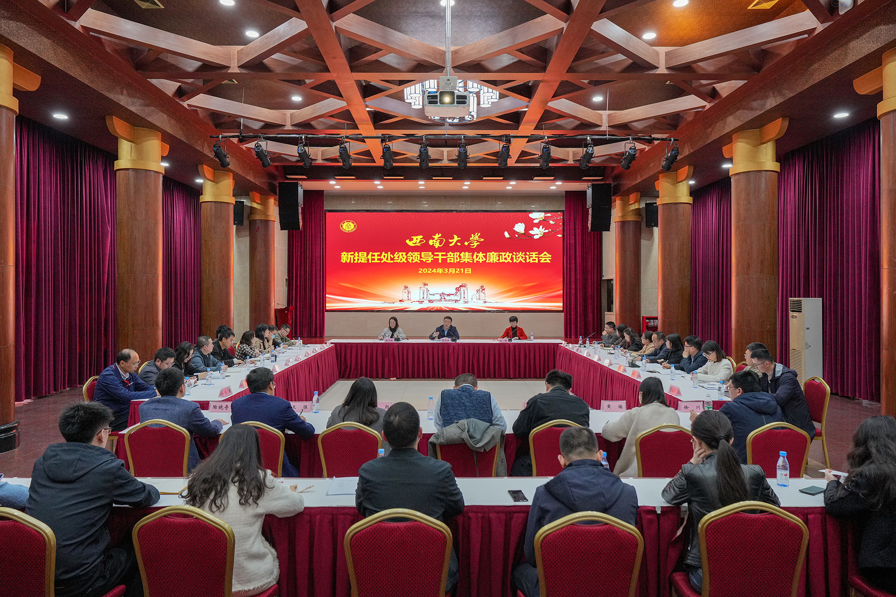 3月21日,学校纪委召开新提任处级领导干部集体廉政谈话会。学校党委副书记、纪委书记夏玉峰出席会议,纪委副书记、纪委办主任、监察处处长朱敏,纪委副书记、党委巡察办主任徐天虹以及27名新提任处级领导干部参加会议。会议由朱敏主持。
