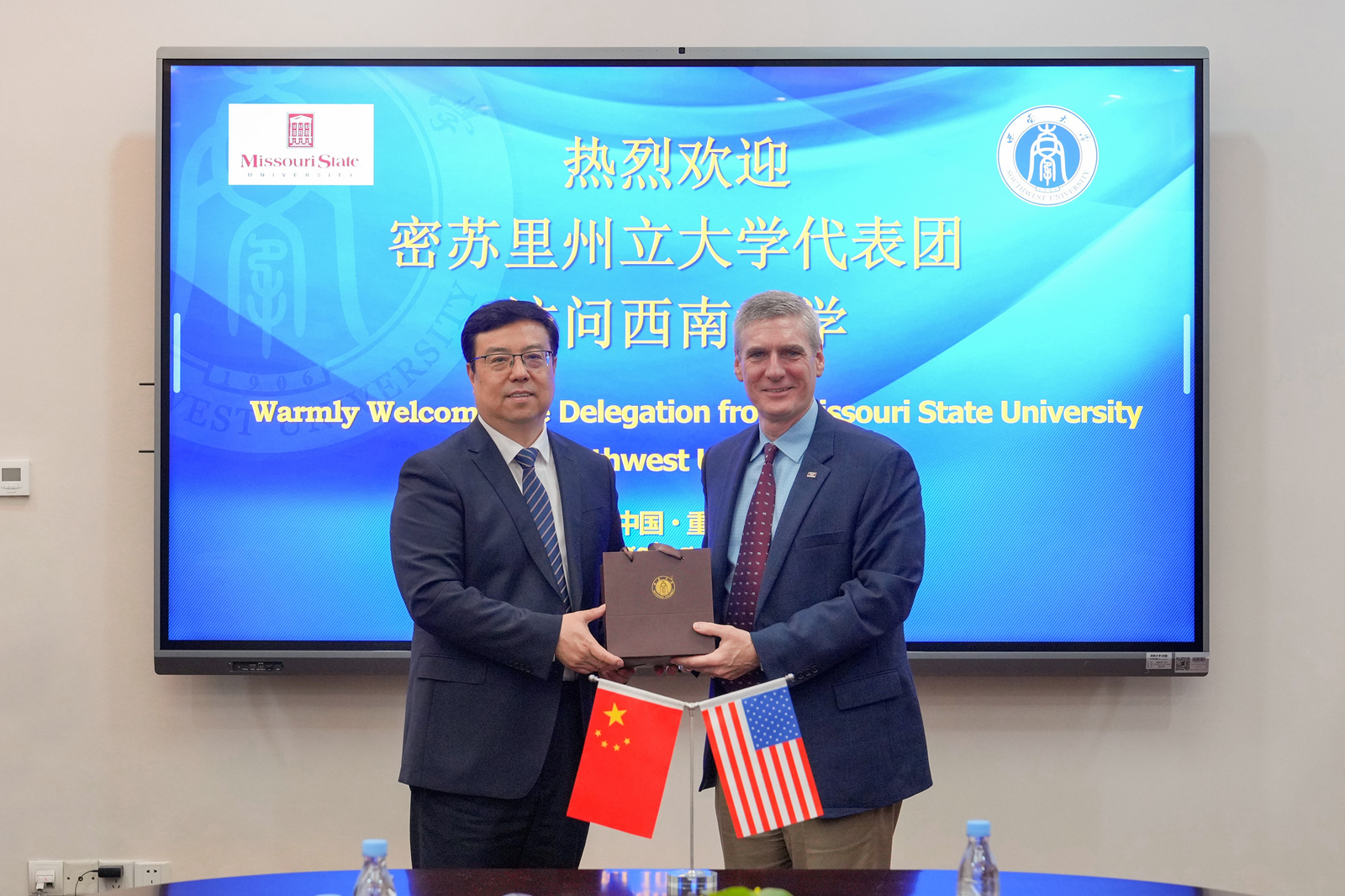 王进军对布拉德一行来访表示热烈欢迎。他指出,密苏里州立大学是学校非常重要的合作伙伴,双方合作基础深厚,前景广阔。两校联合举办植物科学与技术专业中外合作办学项目以来,合作关系不断发展,人员交流日益频繁,人才培养成果丰硕。希望两校以合作办学项目为基础,继续挖掘合作潜力,拓展合作领域,加强资源融合,丰富合作内涵。
