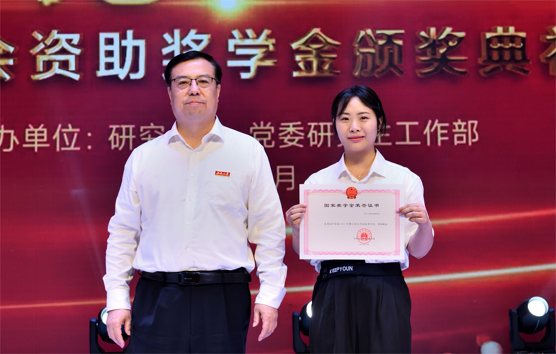 5月10日,学校在光大礼堂举行“研·光”研究生国家奖学金暨社会资助奖学金颁奖典礼。典礼以“追光逐梦,勇毅前行”为主题。校长王进军、党委副书记黄杰出席典礼。