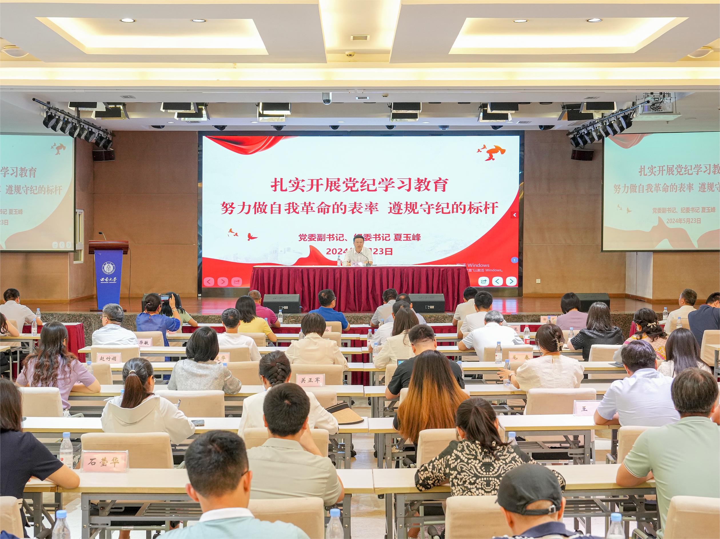 会上,夏玉峰作《扎实开展党纪学习教育,努力做自我革命的表率、遵规守纪的标杆》专题辅导报告。从《中国共产党纪律处分条例》的历史沿革、主旨要义、贯彻执行三个方面进行了解读,并结合高校特点和纪检监察工作实际,通过典型案例分析,对党的政治纪律、组织纪律、廉洁纪律、群众纪律、工作纪律、生活纪律进行了深入透彻的讲解。报告主题鲜明、内涵丰富、针对性强,为纪委干部深入学习、深刻理解、深化运用《中国共产党纪律处分条例》提供了重要遵循。