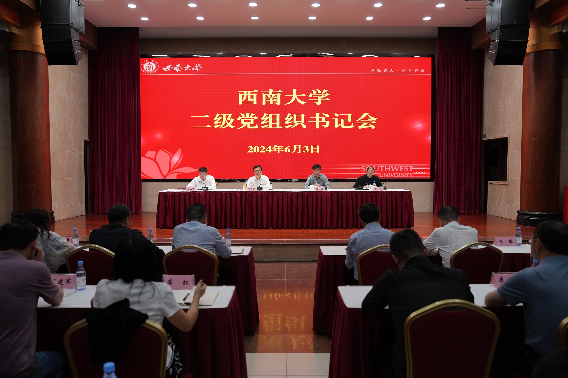 6月3日上午,学校二级党组织书记会在东方红会议厅召开。校长、党委副书记王进军,党委副书记潘洵,党委副书记、纪委书记夏玉峰,党委副书记黄杰出席会议,会议由潘洵主持。