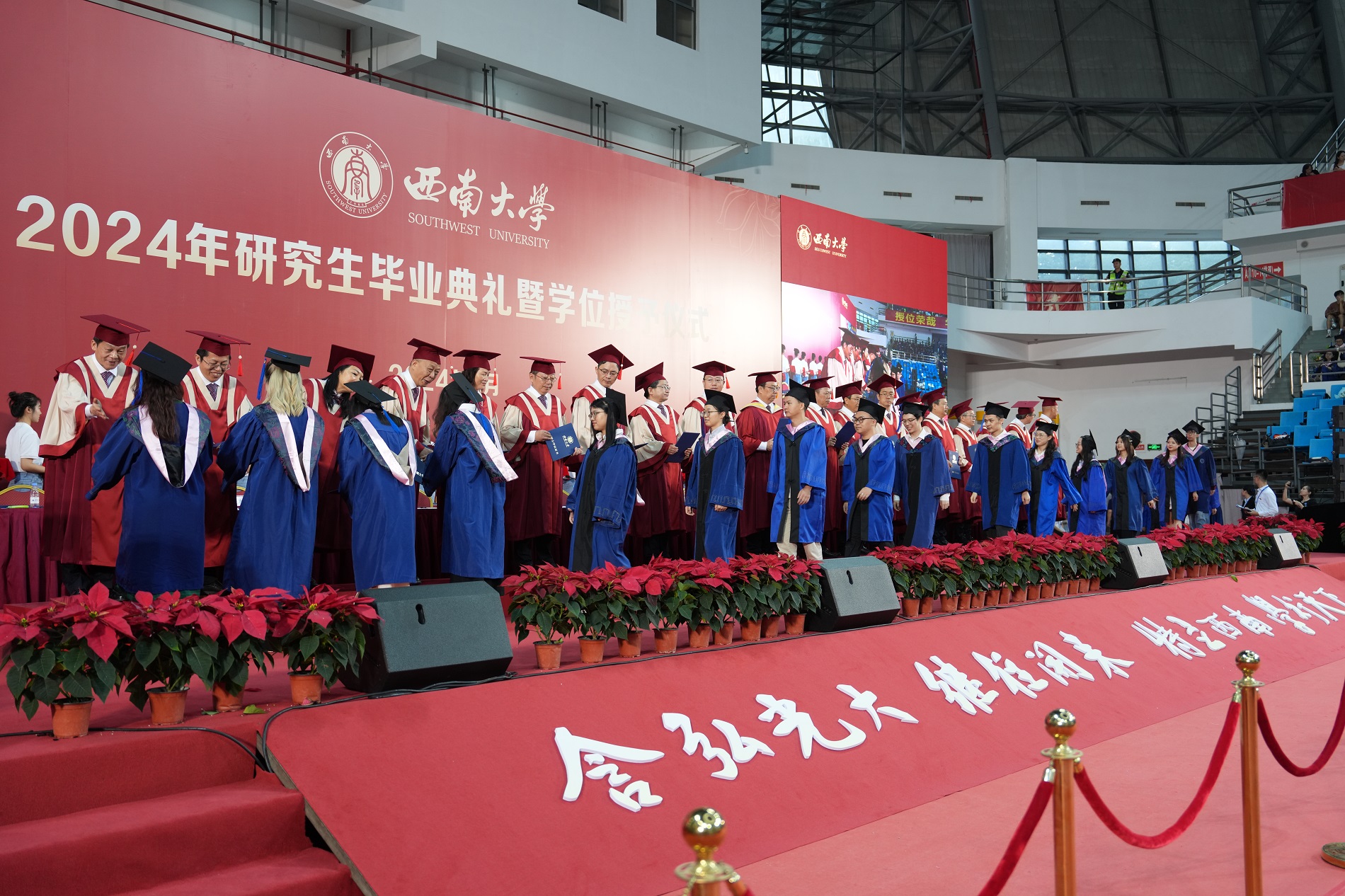 数载潜心求学,今朝拨穗正冠。6月21日上午,学校在中心体育馆举行2024年研究生毕业典礼暨学位授予仪式。校领导、党委常委,学校学生工作领导小组成员单位主要负责人,各研究生培养单位相关负责人、毕业研究生指导教师代表、辅导员、教学秘书,毕业研究生亲属以及博士、硕士学位获得者参加典礼。党委副书记潘洵主持授位仪式,党委副书记黄杰主持毕业典礼。