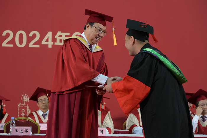 全体学位获得者庄严宣誓。校学位评定委员会主席、校长王进军为博士学位获得者一一授予学位。校学位评定委员会委员为全体硕士学位获得者授予学位。拨穗正冠礼成,今朝扬帆起航,愿2024年全体毕业研究生放飞梦想,踏浪前行。