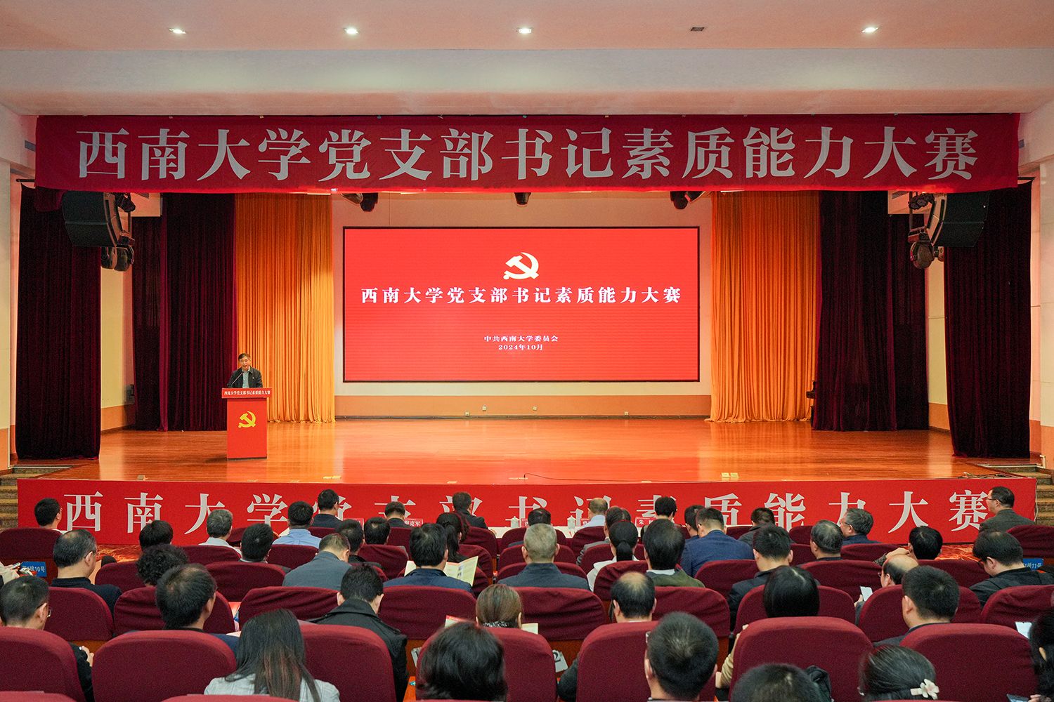 10月25日,学校在音乐学院演奏厅举办党支部书记素质能力大赛。党委副书记潘洵出席并讲话,相关职能部门主要负责人,各二级党组织书记、全体组织员、党支部书记代表和党员代表等近300人参加活动。