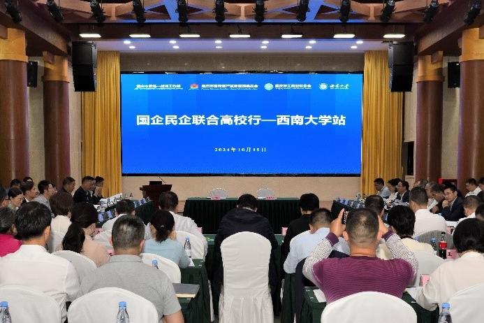 10月15日,学校联合重庆市委统战部、市国资委、市工商联在东方红会议厅举办 “国企民企联合高校行”专场活动。市国资委党委副书记邓美涛,市工商联党组成员、二级巡视员谢华民,学校党委副书记黄杰,副校长葛信勇出席活动。市委统战部、市国资委、市工商联有关处(室)负责人,重庆市市属国有企业15个集团公司及其23家下属公司代表,39家民营企业代表,学校有关部门、学院负责人和专家代表,共120余人参加本次活动。