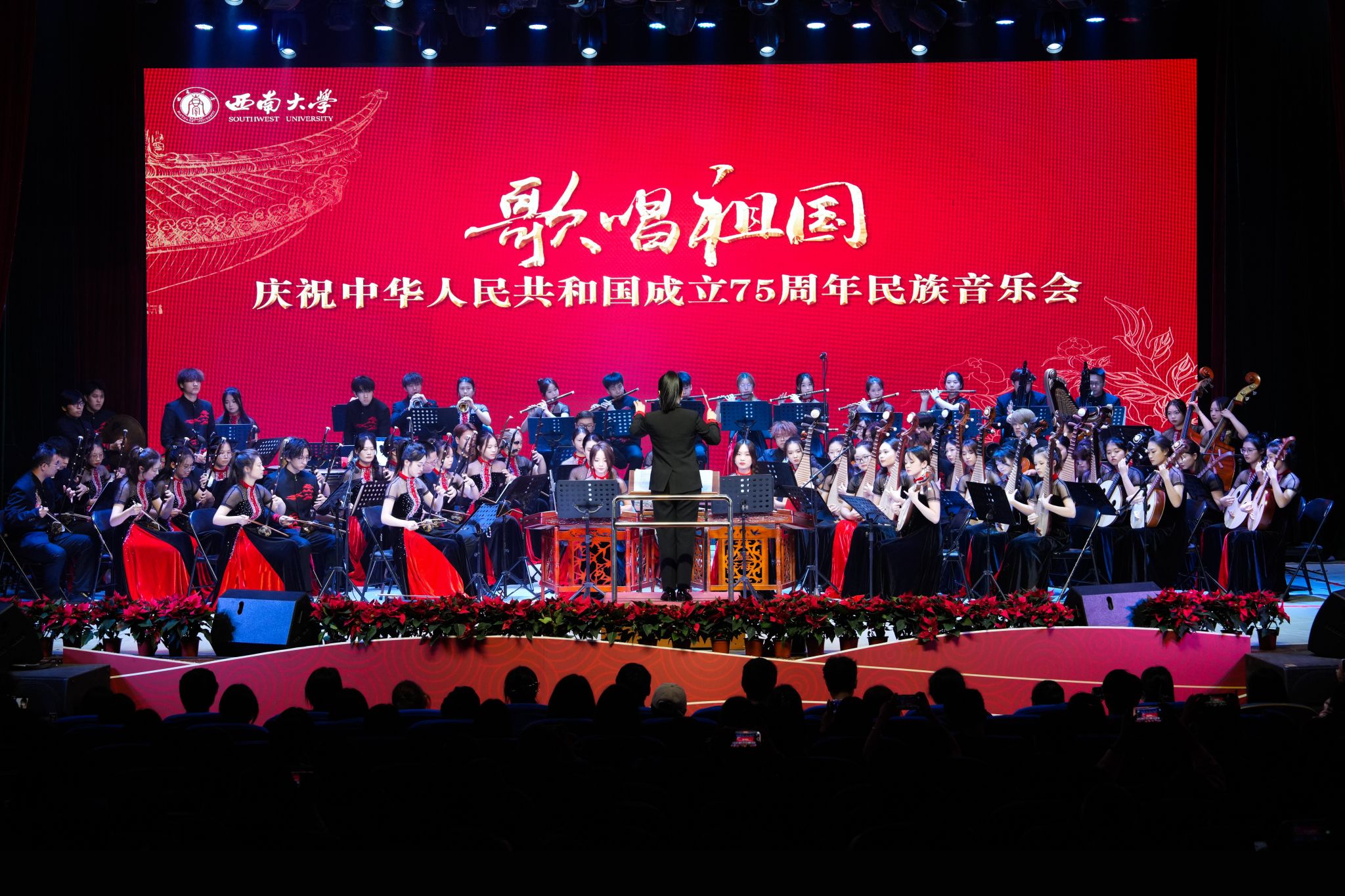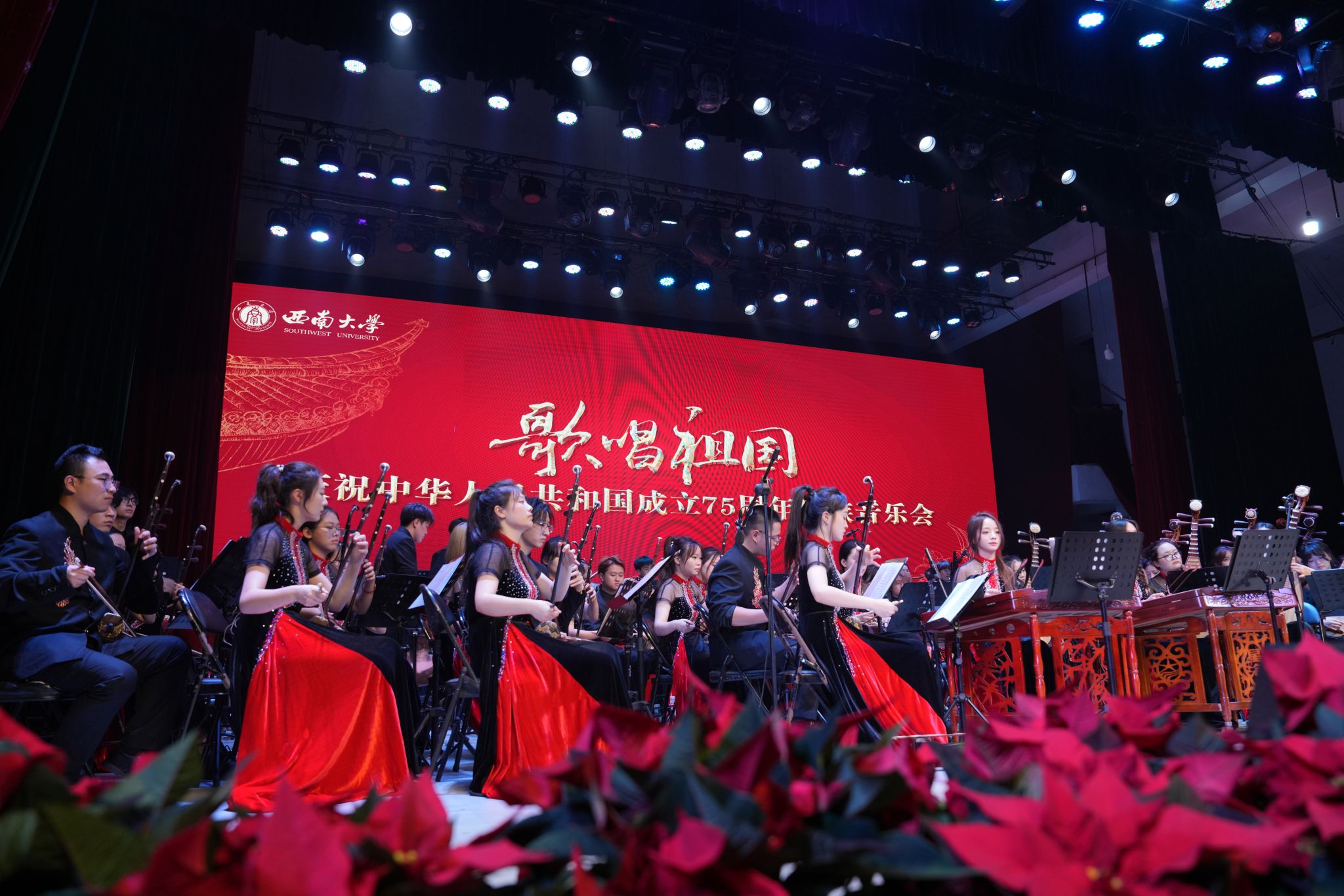 为庆祝中华人民共和国成立75周年,10月11日晚,学校在光大礼堂举办“歌唱祖国”庆祝中华人民共和国成立75周年民族音乐会。党委副书记黄杰、相关职能部门负责人出席音乐会,近千名师生代表到场观摩聆听。音乐会以民族管弦乐合奏、器乐独奏、民族声乐演唱等多种形式呈现,用音乐向祖国献上深情祝福。