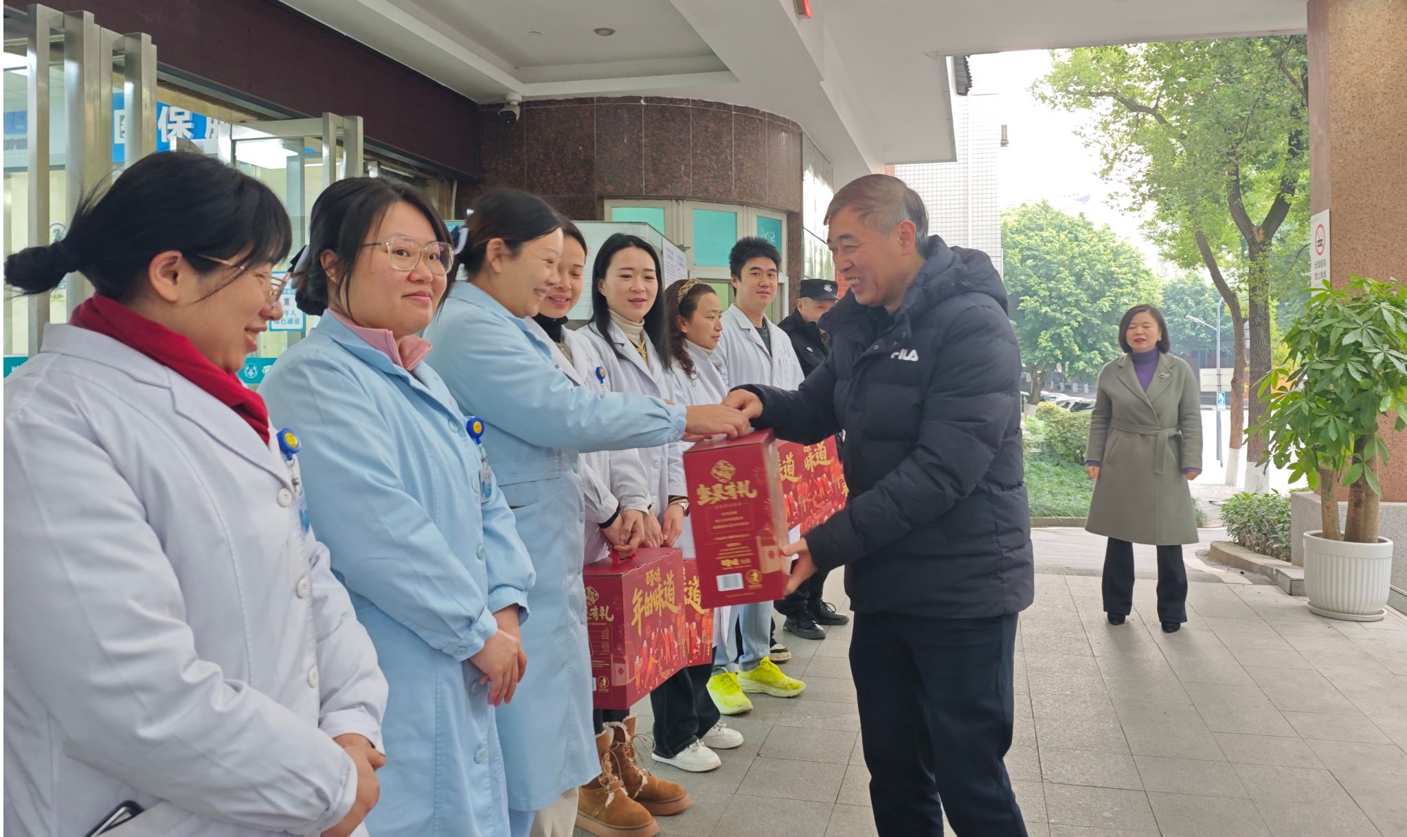 1月28日除夕当日,党委副书记潘洵、黄杰带队走访慰问春节期间坚守岗位的教职员工,向他们致以节日的问候并送上慰问礼品。