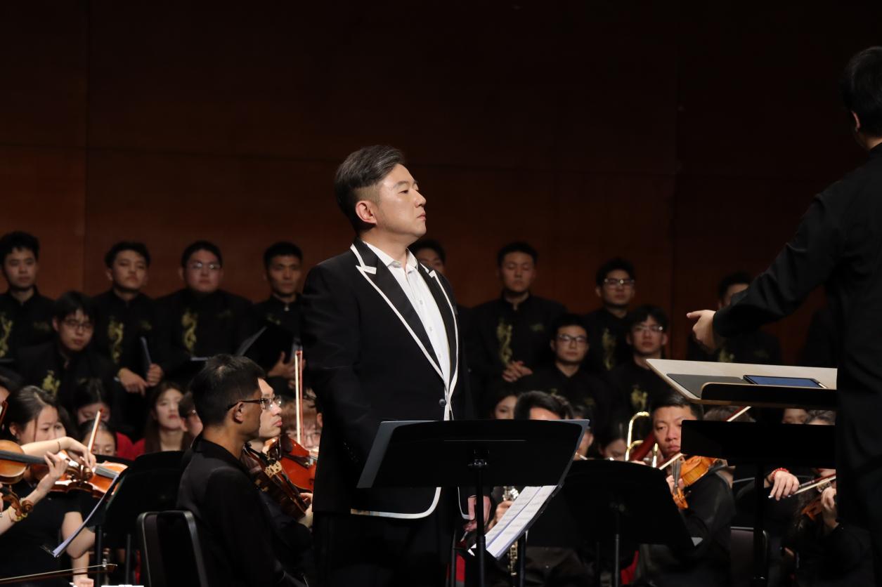4月17日晚,重庆大剧院中剧场座无虚席,一场震撼人心的音乐盛宴拉开了2025重庆大剧院首届大学生艺术节的序幕。学校音乐学院交响乐团(重庆青年交响乐团)与合唱团携手演绎的“赓续血脉·共谱华章”《黄河》大型交响合唱音乐会,以激昂的旋律和深情的歌声,带领现场观众回溯峥嵘岁月,向中华儿女的坚韧精神致敬。