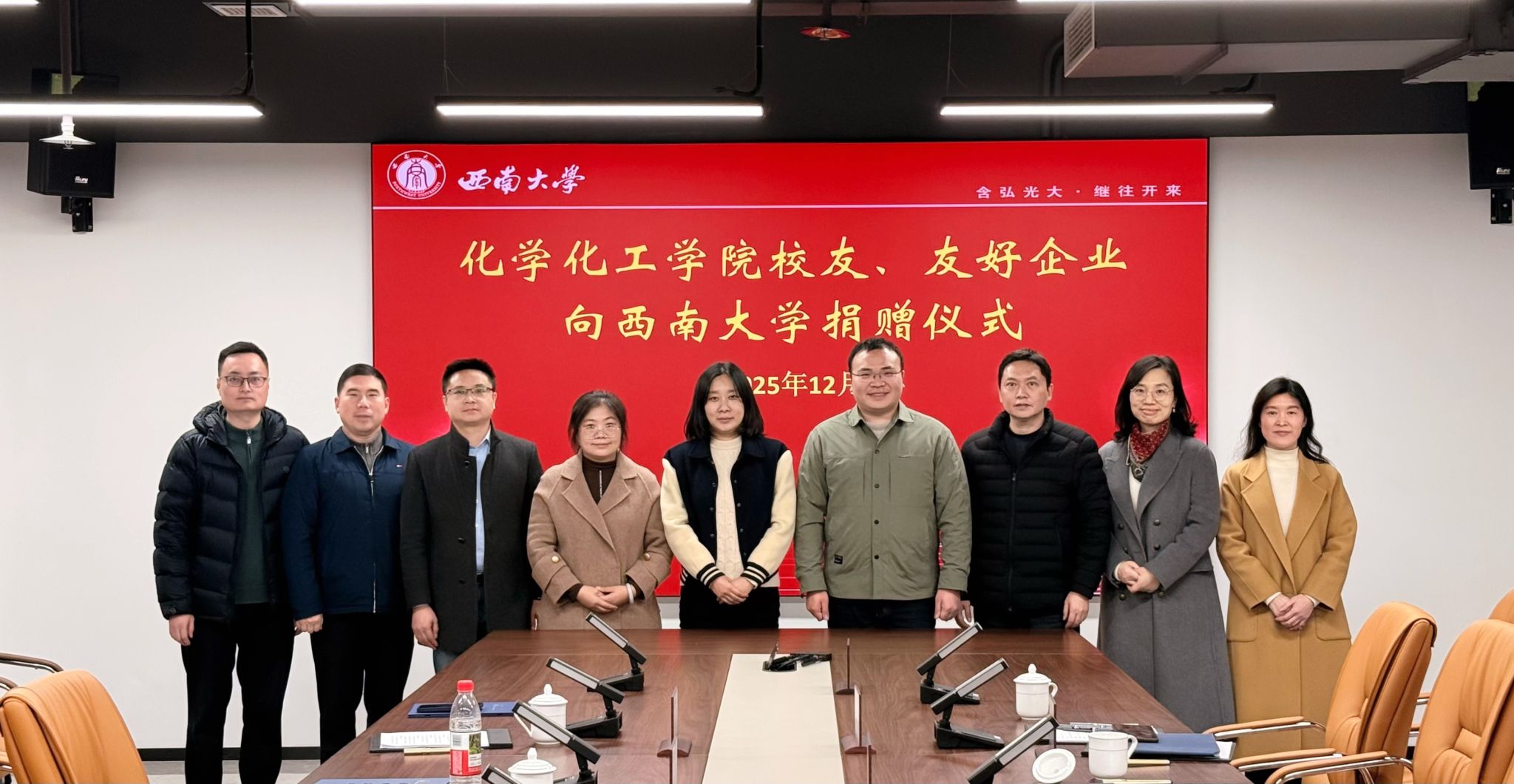 12月11日,化学化工学院校友及友好企业向学校捐赠仪式举行。化合加创业孵化器(重庆)有限公司总经理黄兴亮(化学化工学院校友)、杭州波赛冬生物科技有限公司西南区域总经理谢左欣、重庆舒心一家洗衣有限公司生产总监文豪、安可智达(重庆)企业服务有限公司总经理熊勇出席,学校对外联络办公室、化学化工学院相关负责人参加。